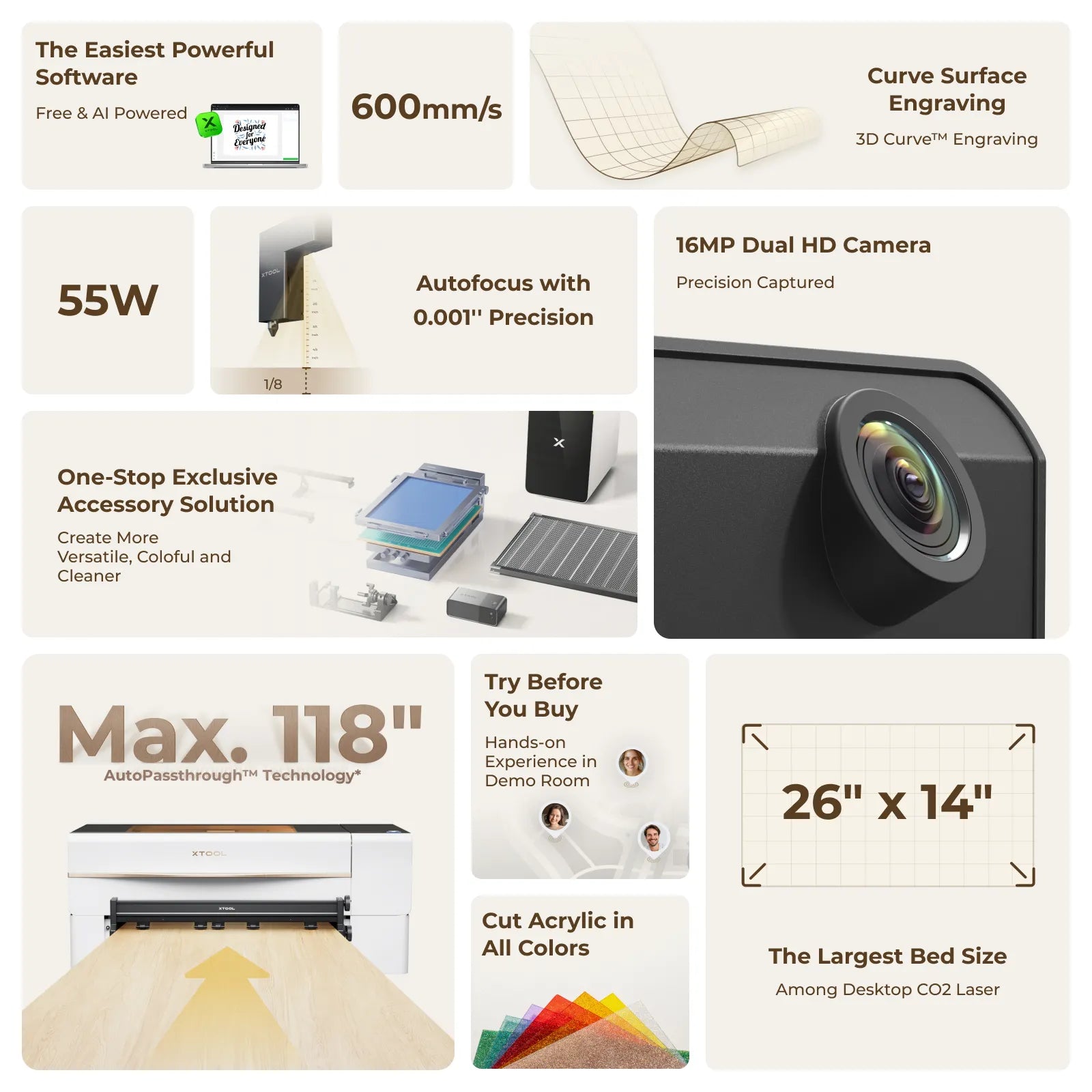• 55W Power: 5x speed when cutting 20mm acrylic & 18mm wood in one pass.